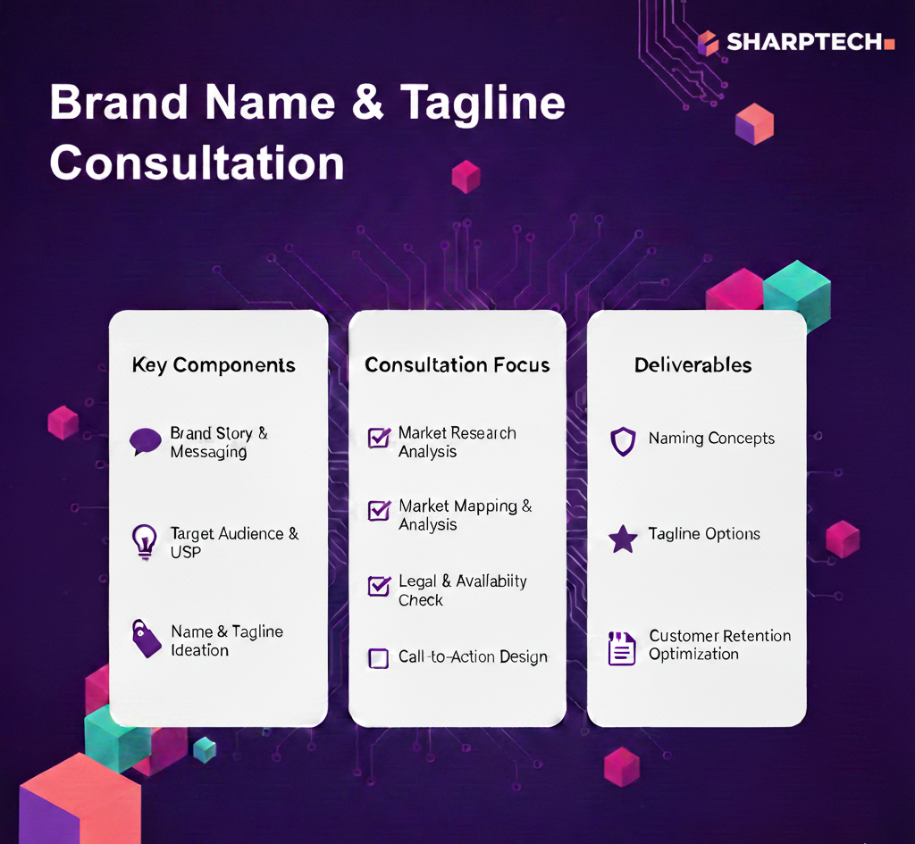 1-hour focused consultation session for brand naming and tagline development. Includes pre-session questionnaire, live brainstorming, and 5 name + tagline combinations with trademark screening recommendations.